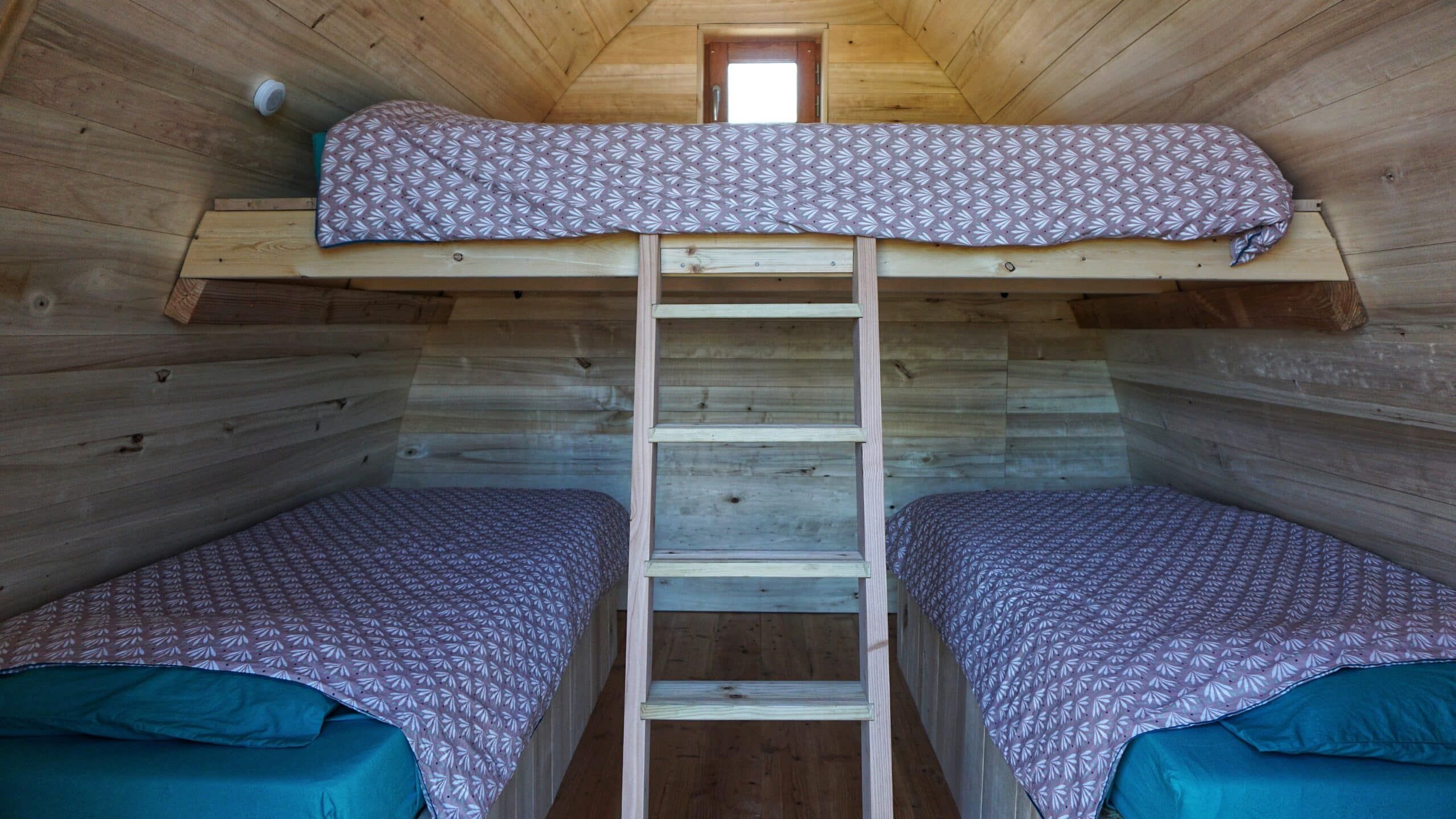 The cocoons can accommodate up to four people as they consist of a double bed on a mezzanine (160×200) and two single beds (90×200).